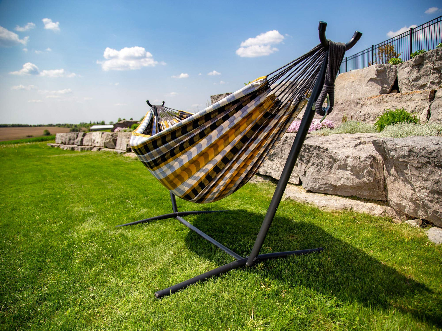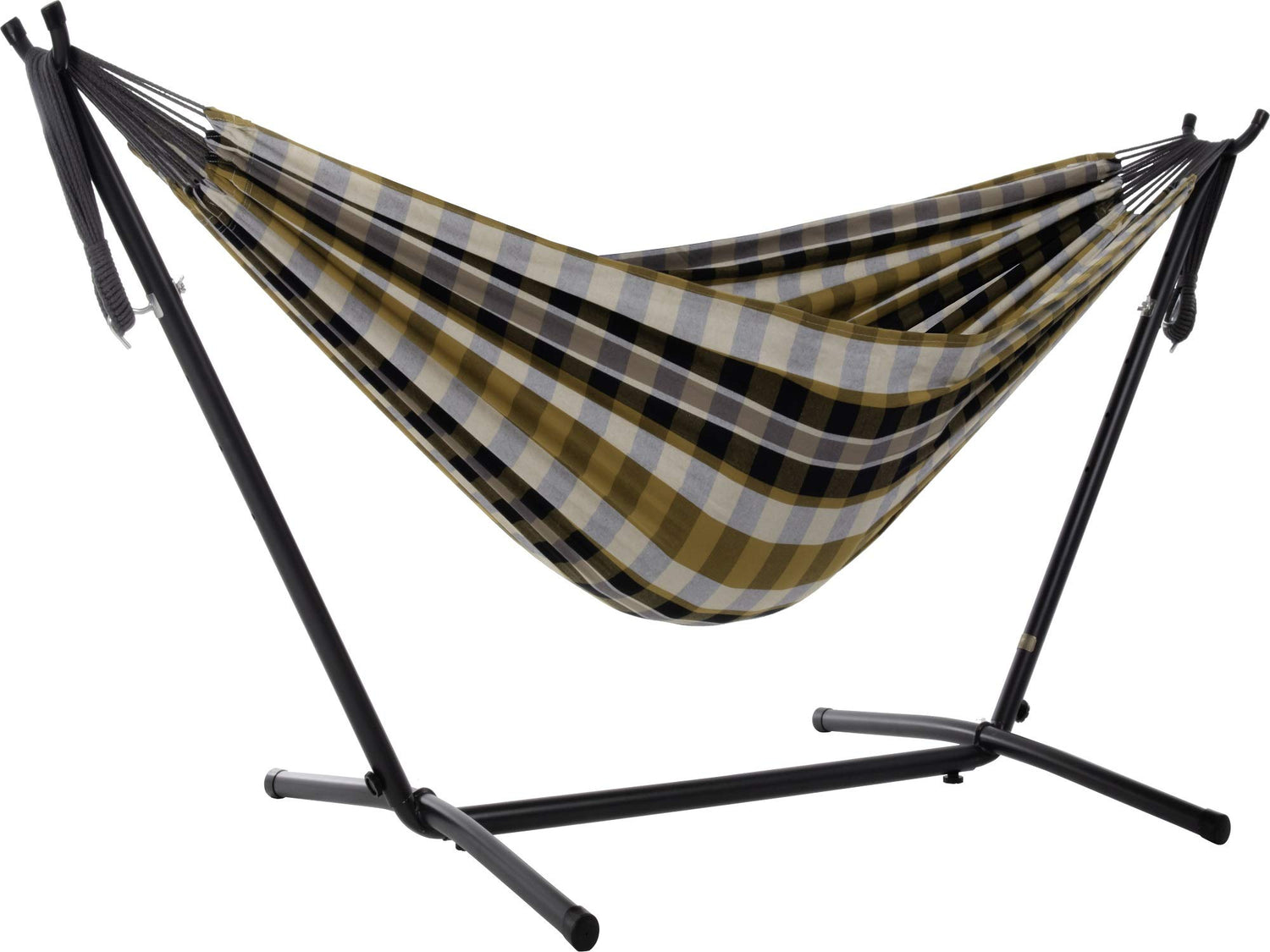 110" Gray & Gold Plaid Brazilian Hammock with Steel Stand - The Hamptons Collection